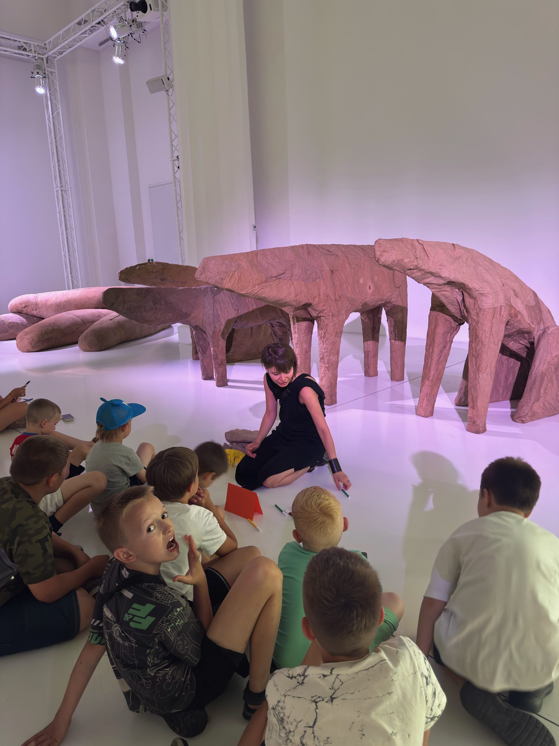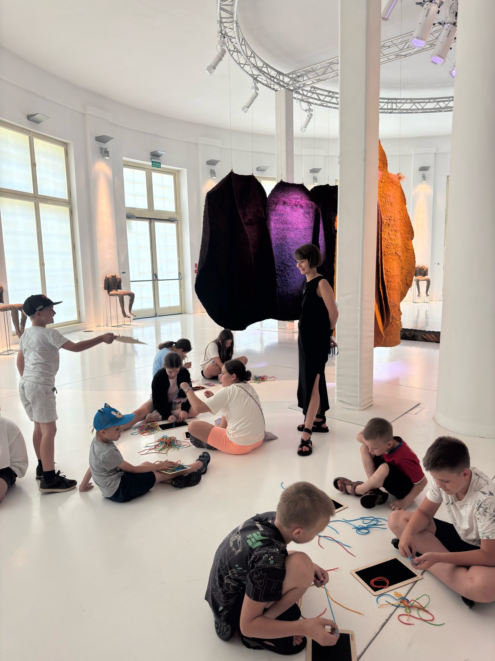 Po zwiedzaniu dzieci wzięły udział w kolejnych tego dnia warsztatach. W otwartej przestrzeni edukacyjnej Pawilonu Czterech Kopuł tworzyli własne instalacje i prace, korzystając z nietypowych materiałów i technik. Praca w grupach sprzyjała twórczej wymianie pomysłów i rozwijaniu wyobraźni.
