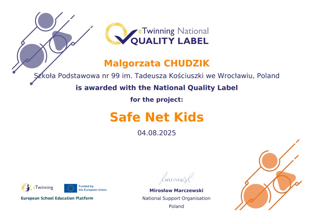 Z radością informujemy, że projekt eTwinning Safe Net Kids, realizowany w naszej szkole w roku ubiegłym, został wyróżniony Krajową Odznaką Jakości eTwinning.