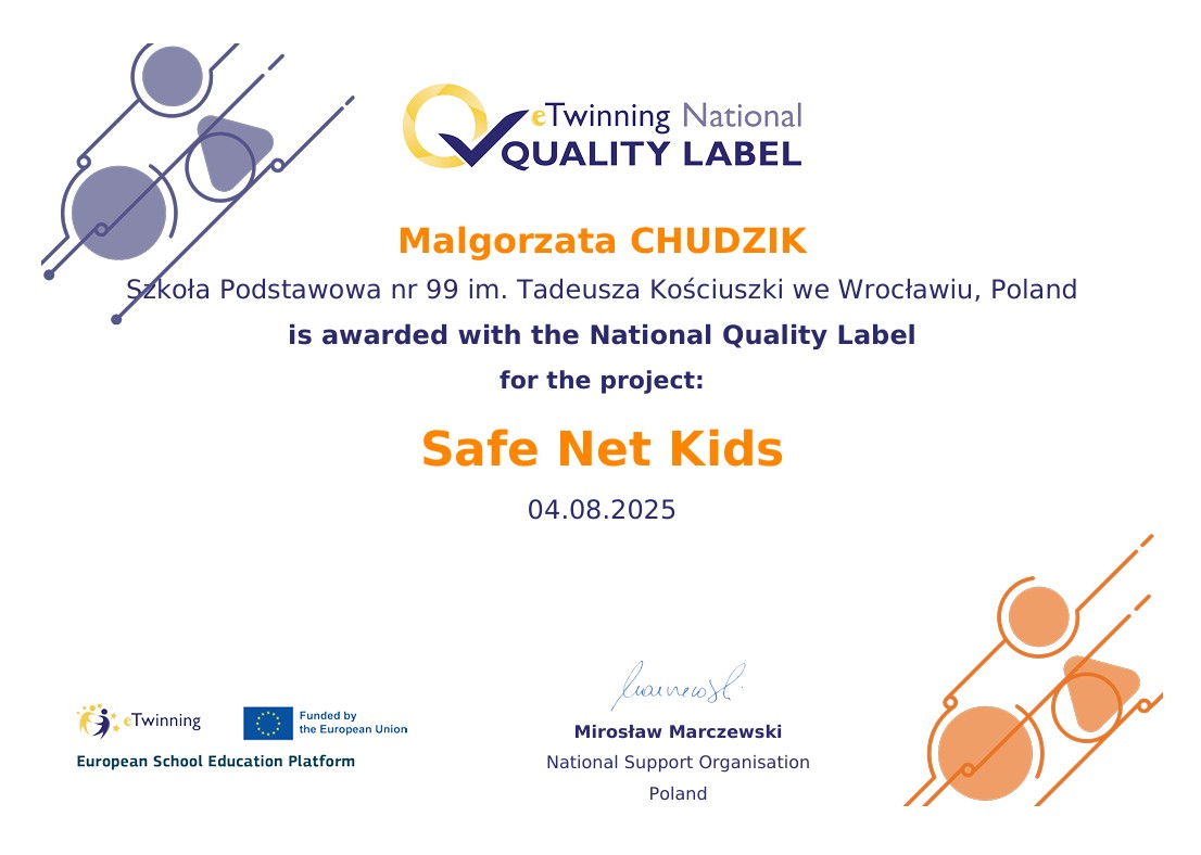 Z ogromną przyjemnością informujemy, że realizowany w naszej szkole w roku szkolnym 2024/2025 projekt eTwinning „Safe Net Kids” został wyróżniony Europejską Odznaką Jakości!