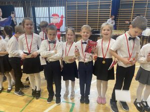6 grudnia ( sobota), dzieci z klasy 2B i 2C, wzięły udział w tanecznym turnieju Mikołajkowym. Turniej był zwieńczeniem 3 miesięcznej nauki tańca w naszej szkole, realizowanej w ramach projektu Taniec moją nową pasją. Celem projektu było wspomaganie wszechstronnego i harmonijnego rozwoju dziecka, wyzwalanie w nim aktywności ruchowej przez taniec, opartej na naturalnej potrzebie ruchu. Dzieci pod okiem instruktorki pani Alicji Majewskiej raz w tygodniu uczyły się: walca, cza-czy i polki. Podczas finału pokazały swoje umiejętności taneczne, które zostały docenione i nagrodzone medalami oraz pucharem dla szkoły. Wszystkim uczestnikom gratulujemy, wielkie brawa!