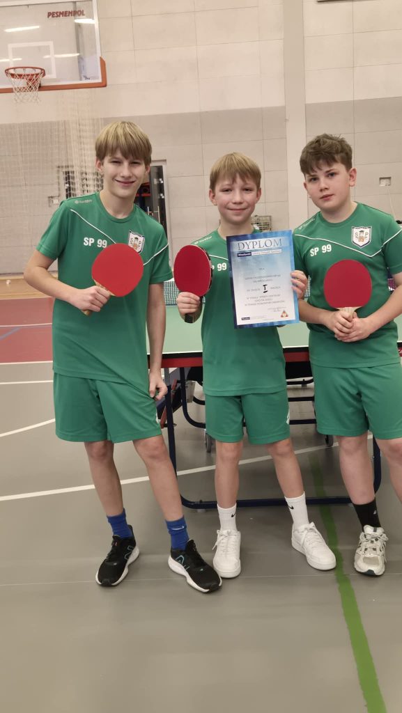 Z radością informujemy o wspaniałym osiągnięciu naszych uczniów w rozgrywkach tenisa stołowego. W lutym i marcu Antek z klasy 6a oraz Janek i Julek z klasy 5a reprezentowali Szkołę Podstawową nr 99 w Mistrzostwach Strefy Centrum Wrocław. Nasi zawodnicy pokazali doskonałą formę – wygrali wszystkie mecze, nie pozostawiając rywalom szans, i ostatecznie zajęli I miejsce spośród 20 drużyn ze szkół podstawowych.