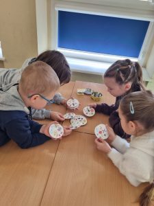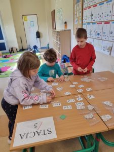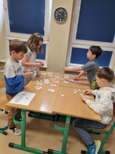 Nie zabrakło również pracy metodą stacji zadaniowych. Uczniowie rozwiązywali różnorodne zadania: układali puzzle, pracowali z tekstem, ćwiczyli liczenie, tworzyli tangramy, dopasowywali podpisy do obrazków, analizowali wartości pieniężne oraz grali w gry edukacyjne. Każda aktywność angażowała inne umiejętności i zachęcała do aktywnego udziału w nauce.