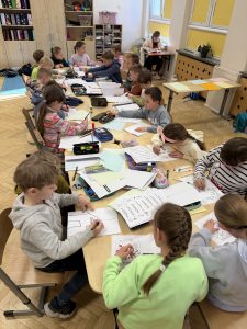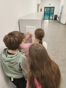 Dużym zainteresowaniem cieszyło się także dyktando biegowe, które połączyło naukę ortografii z ruchem i współpracą w grupie. Uczniowie uzupełniali tekst, a następnie wspólnie sprawdzali poprawność wykonanych zadań.